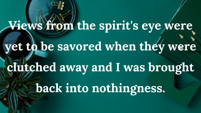 These views from the spirit’s eye were yet to be savored when they were clutched away and I was brought back into nothingness within the cloth with a jerk as I was pushed forward and made to stand in the limelight.