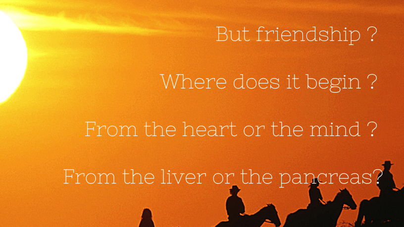 Let’s rewind and ask ourselves this question ? How does friendship begin? We all know how love begins….Millions of writers have done it before me. But friendship ? where does it begin ? From the heart or the mind ? from the liver or the pancreas?