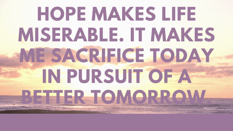 Hope makes life miserable. It makes me sacrifice today in pursuit of a better tomorrow.