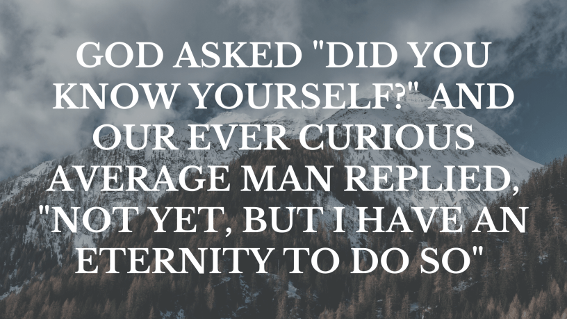 After his death, he went to the next life and there stood the average man. As he looked at him curiously in wonder, God asked “Did you know yourself?” and our ever curious average man replied, “Not yet, but I have an eternity to do so” and thus began the life of a curious angel. and that is a story for another day.