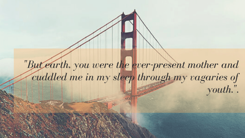 I claimed your fruits and I wanted more. I claimed your other children as mine and made them our own. But Earth, O loving mother, you just stood silently and provided me the pathway to become a man