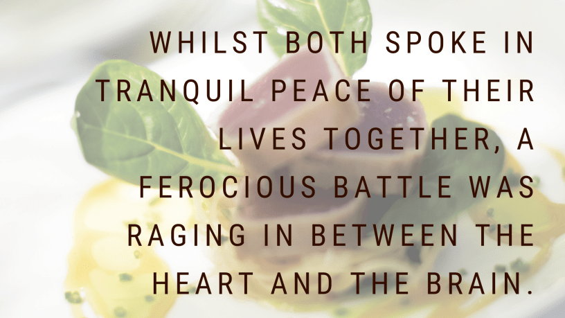 They were kindred spirits locked in the throes of love. Like friends, they spoke of their lives hopes and dreams. Unlike friends, they spoke of their lives together. It was not about my hopes, dreams, and ambitions any longer, but our hopes, dreams, and ambitions. Whilst both spoke in tranquil peace of their lives together, a ferocious battle was raging in between the heart and the brain.