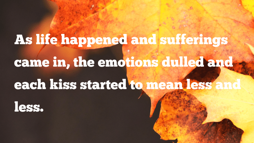 As life happened and sufferings came in, the emotions dulled and each kiss started to mean less and less. The two lovers who had created their own universe away from mankind’s stink slowly felt their universe fusing into the great big universe of man. But man is a miserable creature and his big universe started transporting its misery into these two tiny hearts. The satellite after a brief shining moment within the stars had crashed onto earth.