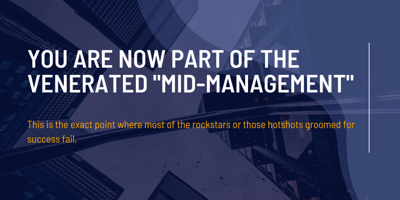 Simply put, entry into mid-management is the end of the first chapter of your career and a start to a new one. It has it’s own challenges and most importantly a new playbook is required to manage it.